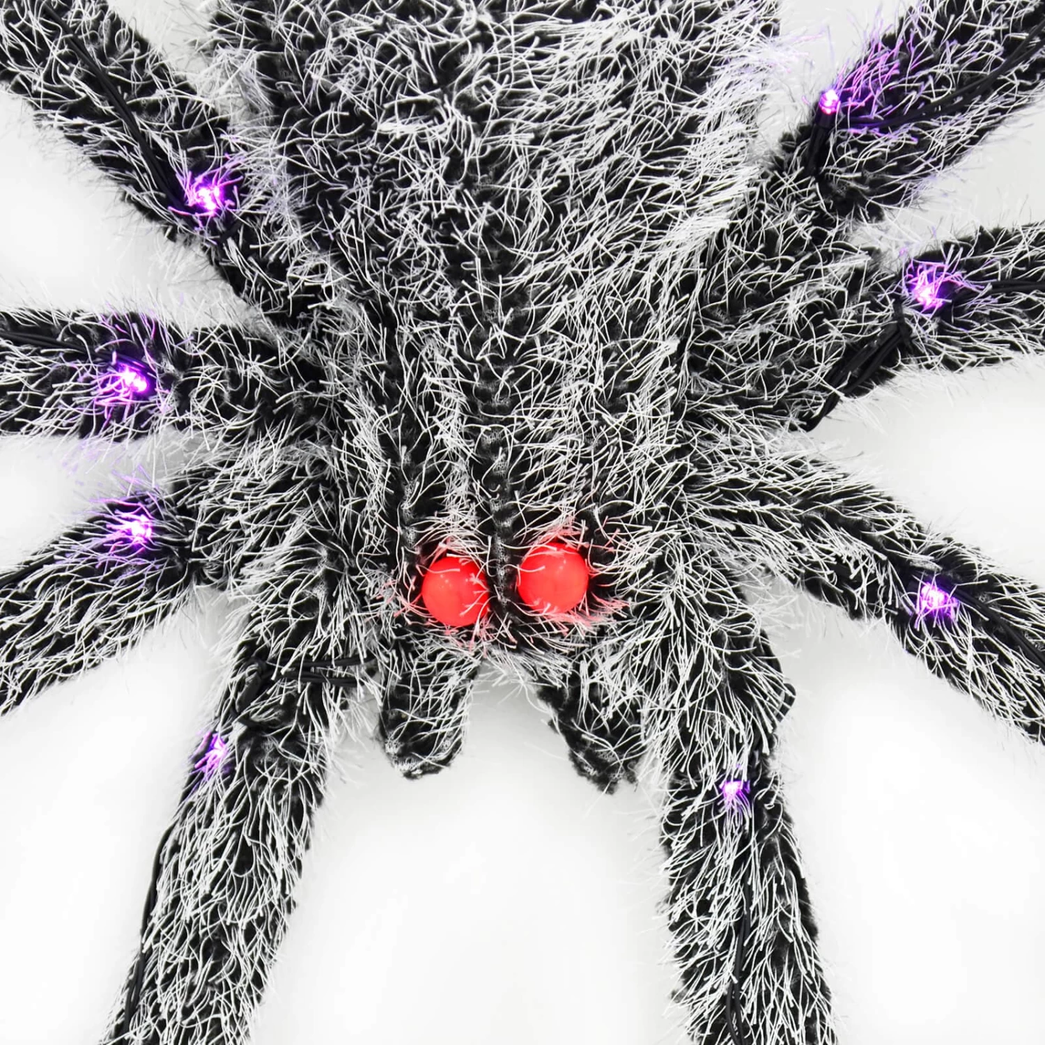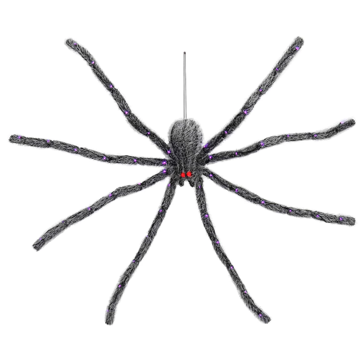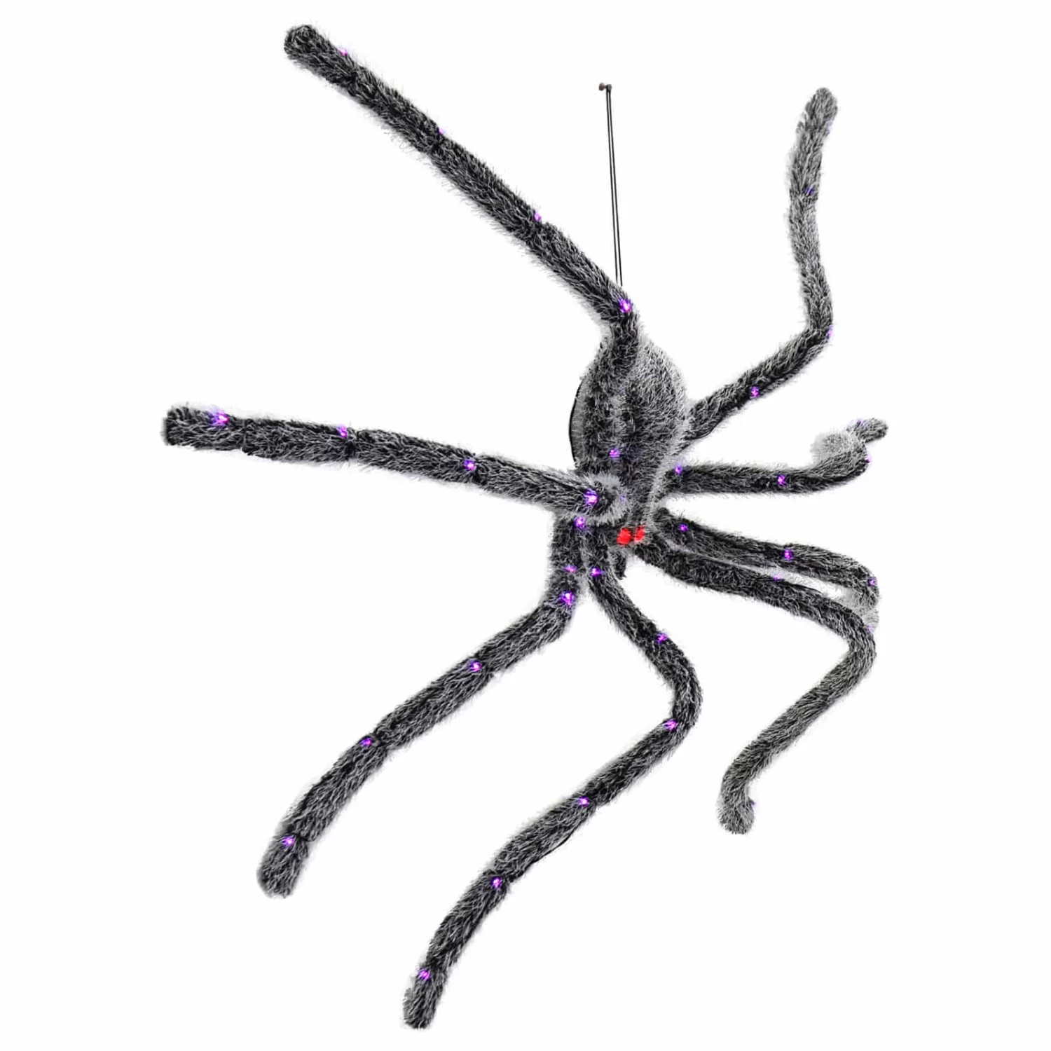 The 5ft light up spider from Cackle & Co range is the stuff of nightmares. With its black and silver hairy body the large Halloween spider prop lights up with purple LEDs on the legs, and red LEDs in the eyes. Wire in the legs let you pose the spider ready to strike!