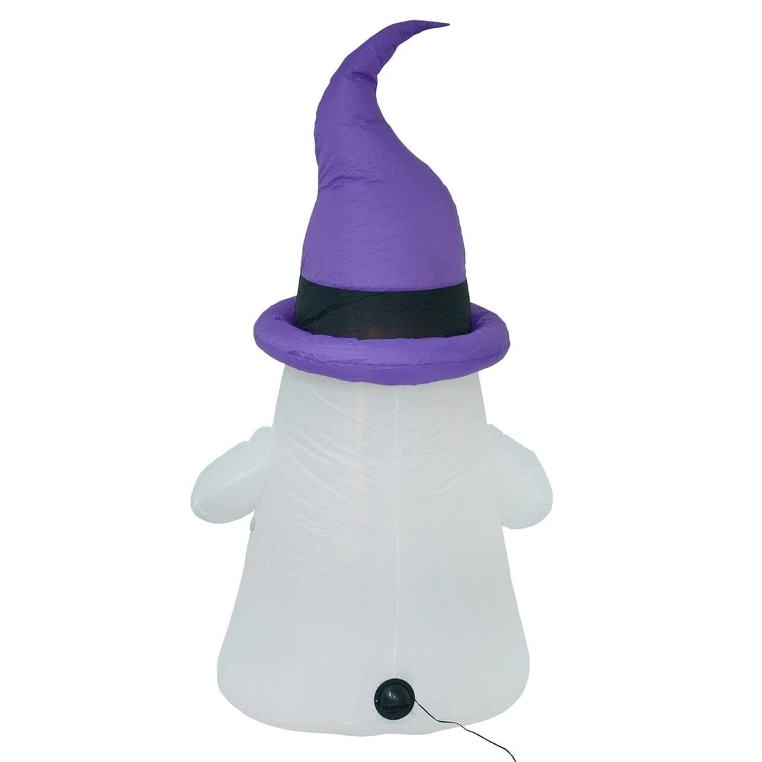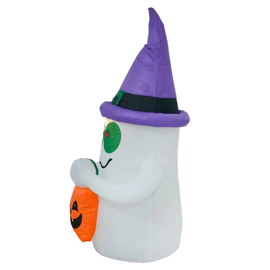This spook-tacular inflatable ghost wears a tall purple witch hat with buckle detail and white LED lights, has huge green eyes with glowing red LEDs and clutches an orange candy bag