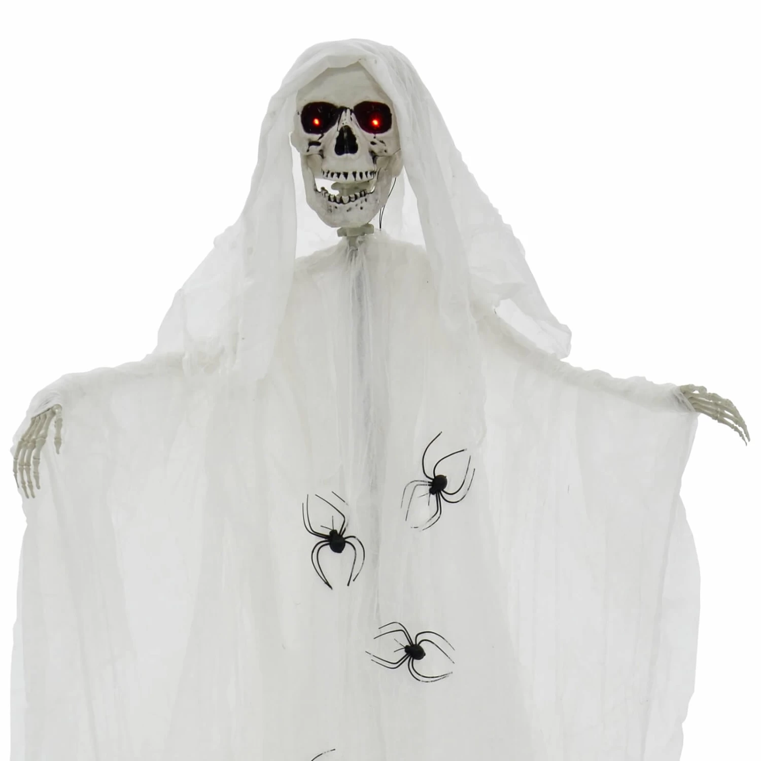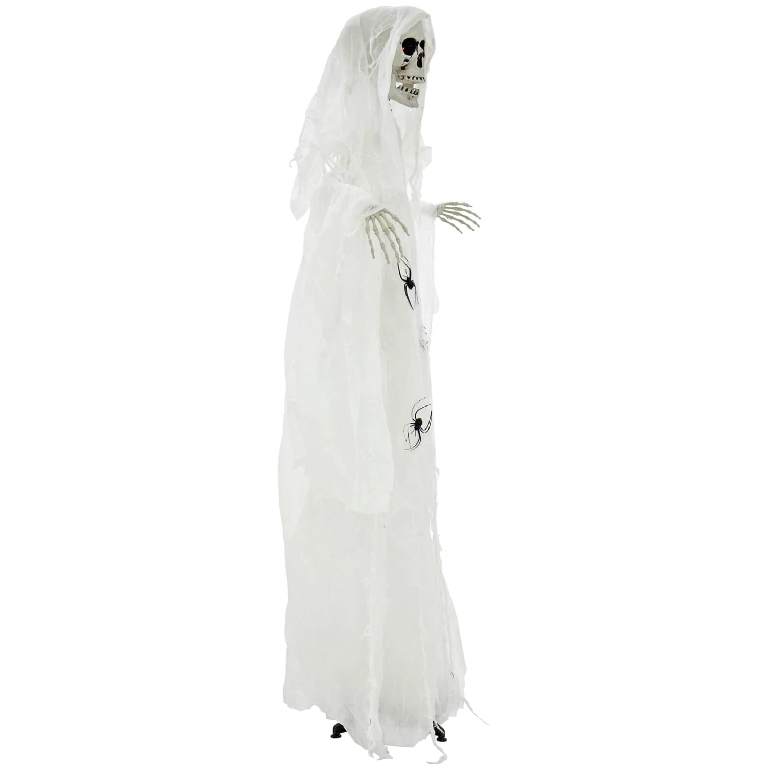 The standing skeleton has flashing red eyes and makes scary laughter and scream sounds. The white fabric robes are decorated with black plastic spiders. Standing 1.83m (6′) tall with a touch sensor and moving jaw, it’s perfect for Halloween parties. Comes with stand. Suitable for indoor use only.