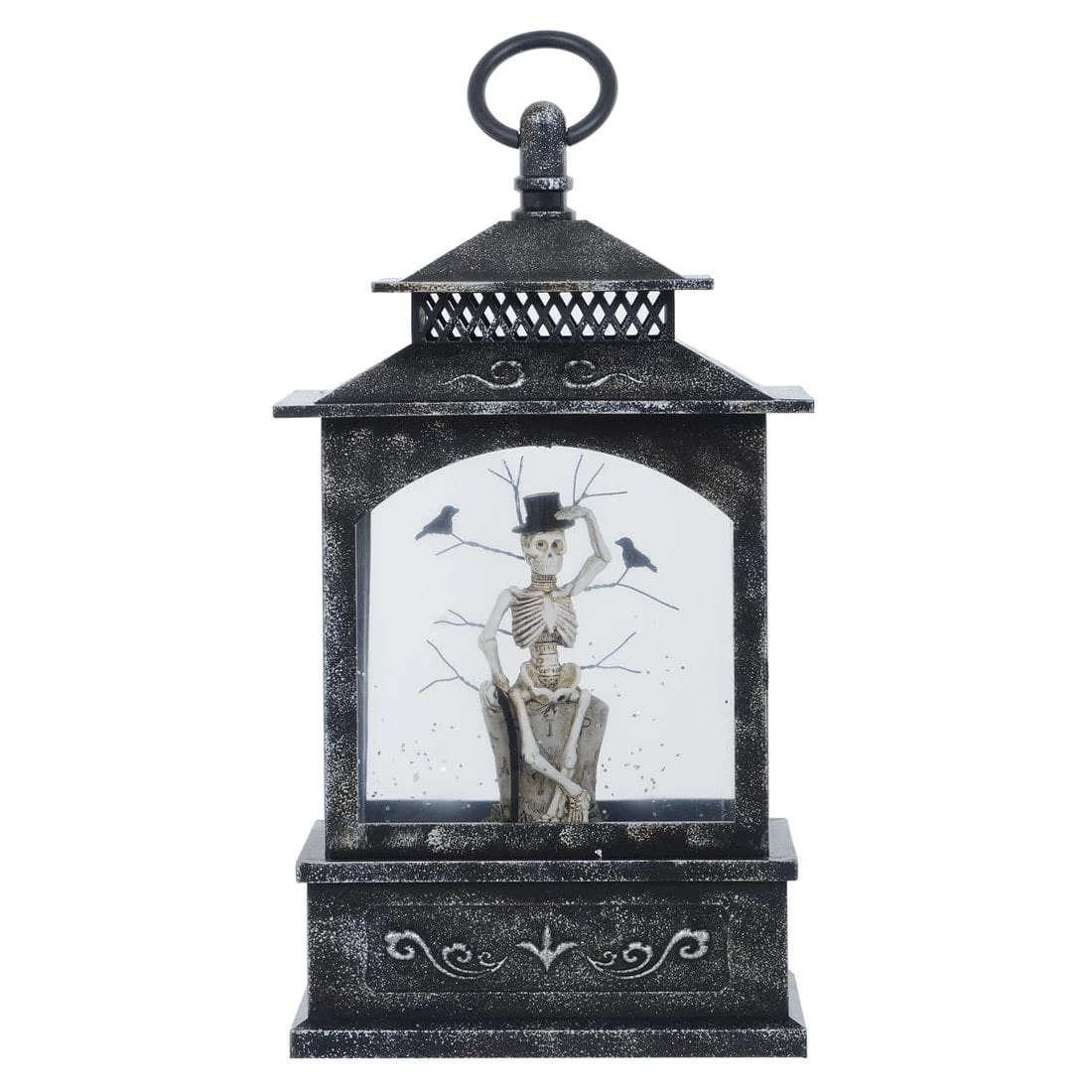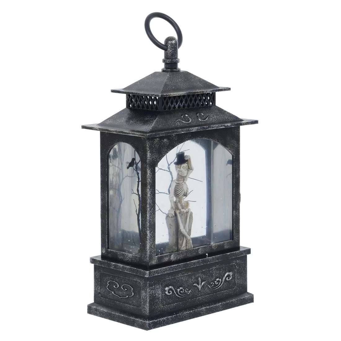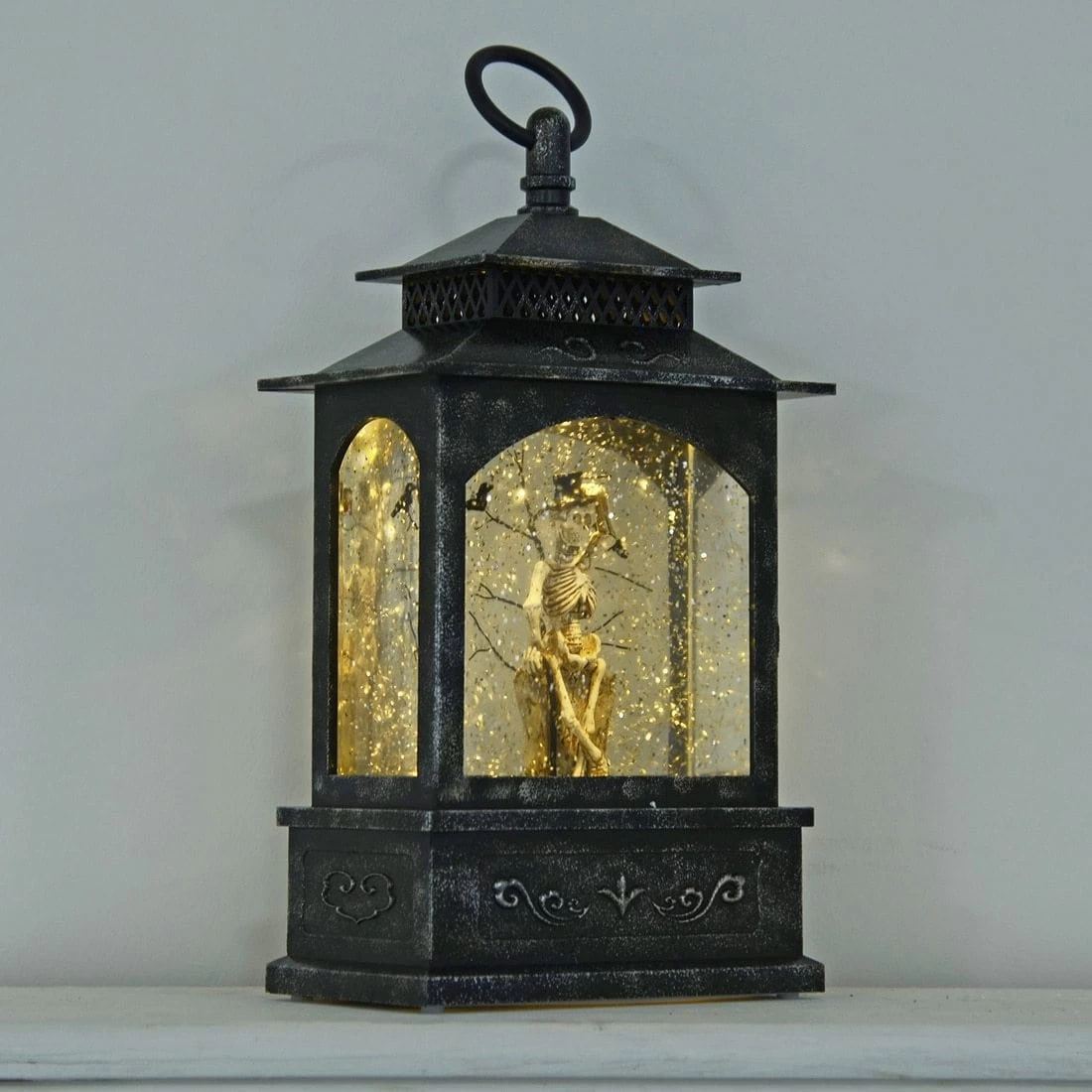 Set the mood for a spook-tacular Halloween party with this novelty skeleton lantern! The battery operated decoration has an antique looking design and features a little skeleton inside. Switch the lantern light up and the glittery water swirl around inside! Perfect for displaying at your window or in your porch to welcome trick-or-treaters!