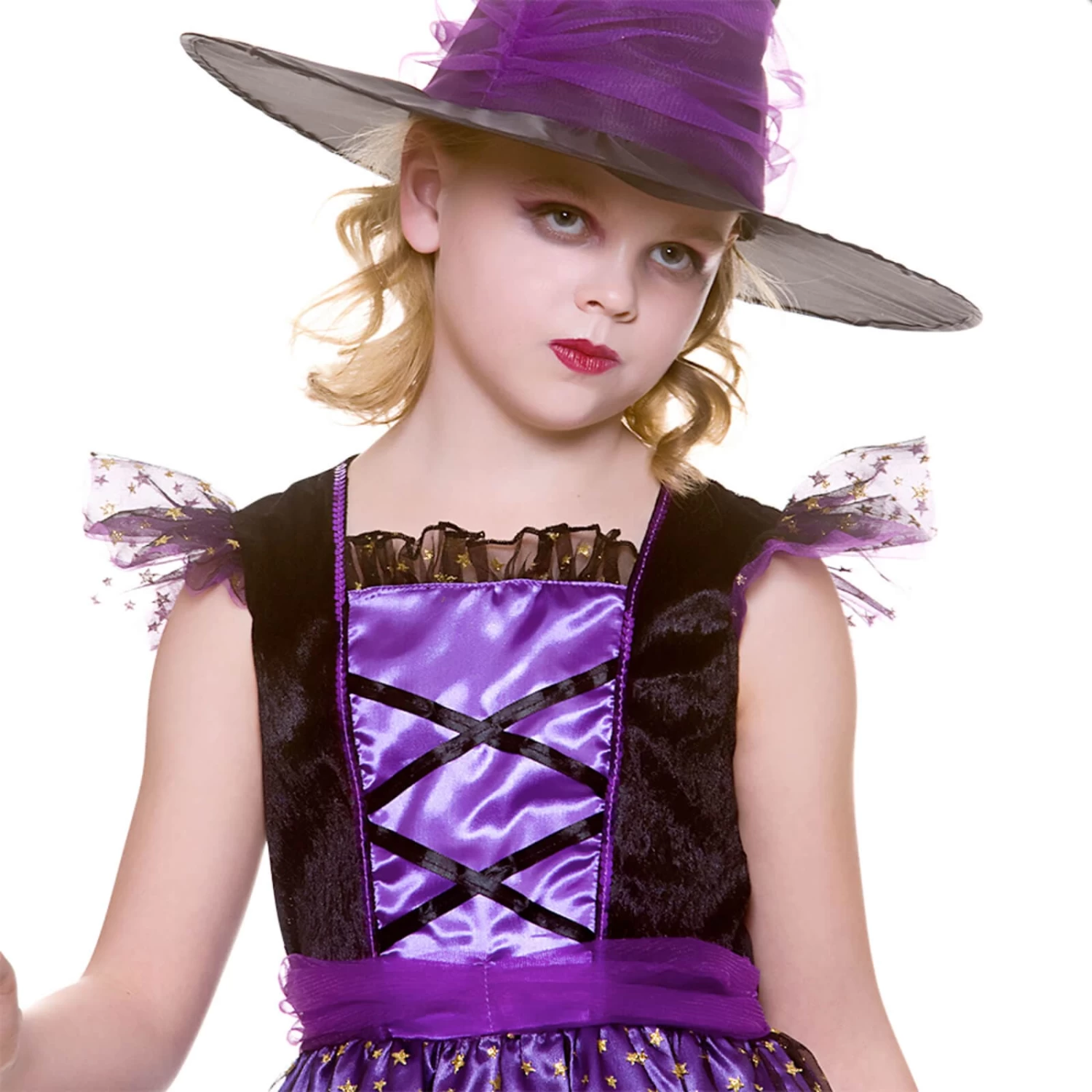The stunning witch outfit includes a black and purple satin dress with night scene print, frilled bodice, and gold star tulle overlay. A matching black and purple pointy witch hat completes the costume.