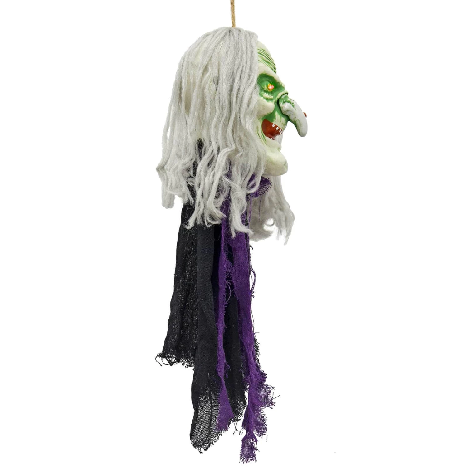 The Hanging Head Halloween decoration has flashing red LED eyes, green tinged skin, a big hooked nose, long grey hair and laughs like a banshee. Whether it’s a witch, goblin or troll, it wears the remains of a tattered black and purple cloak. At 64cm (25″) tall, it’s perfect for hanging in your porch.