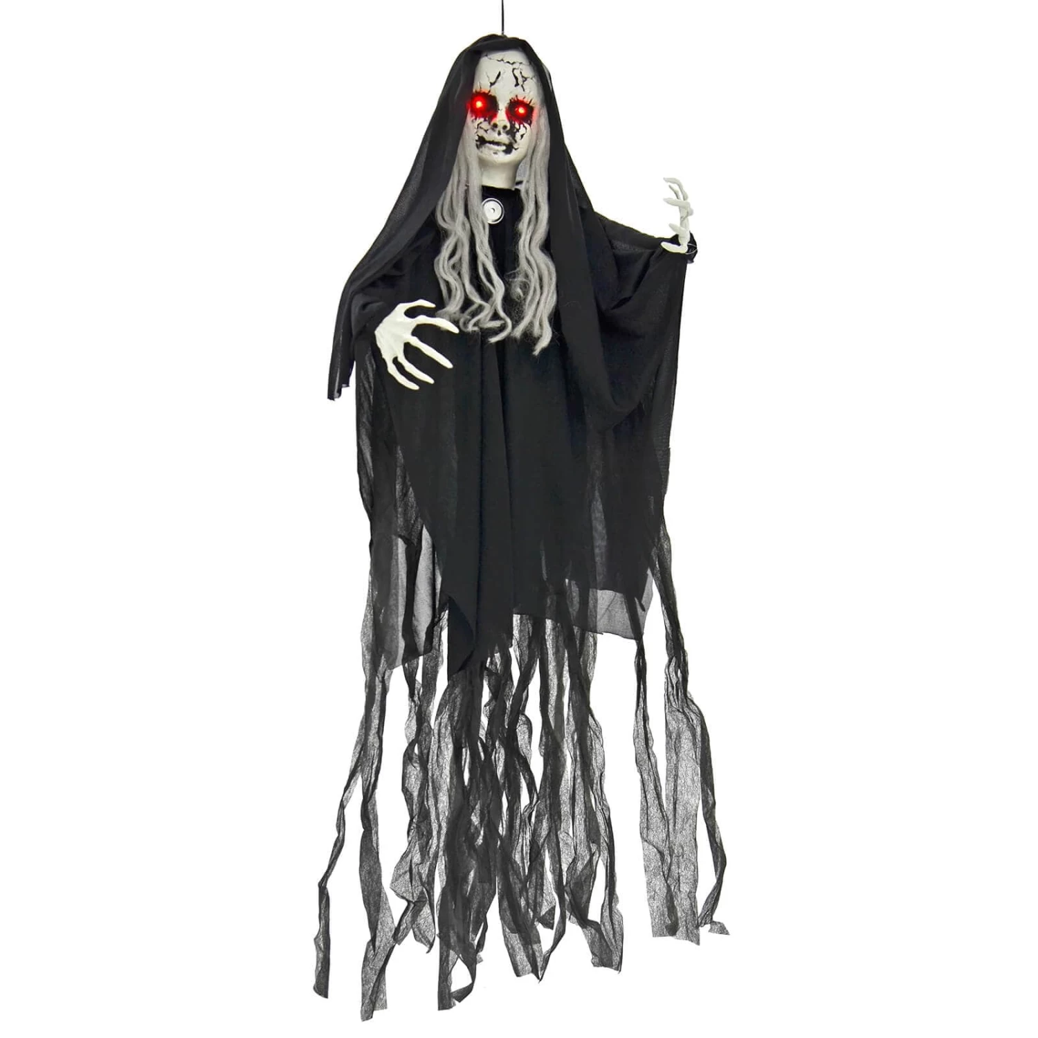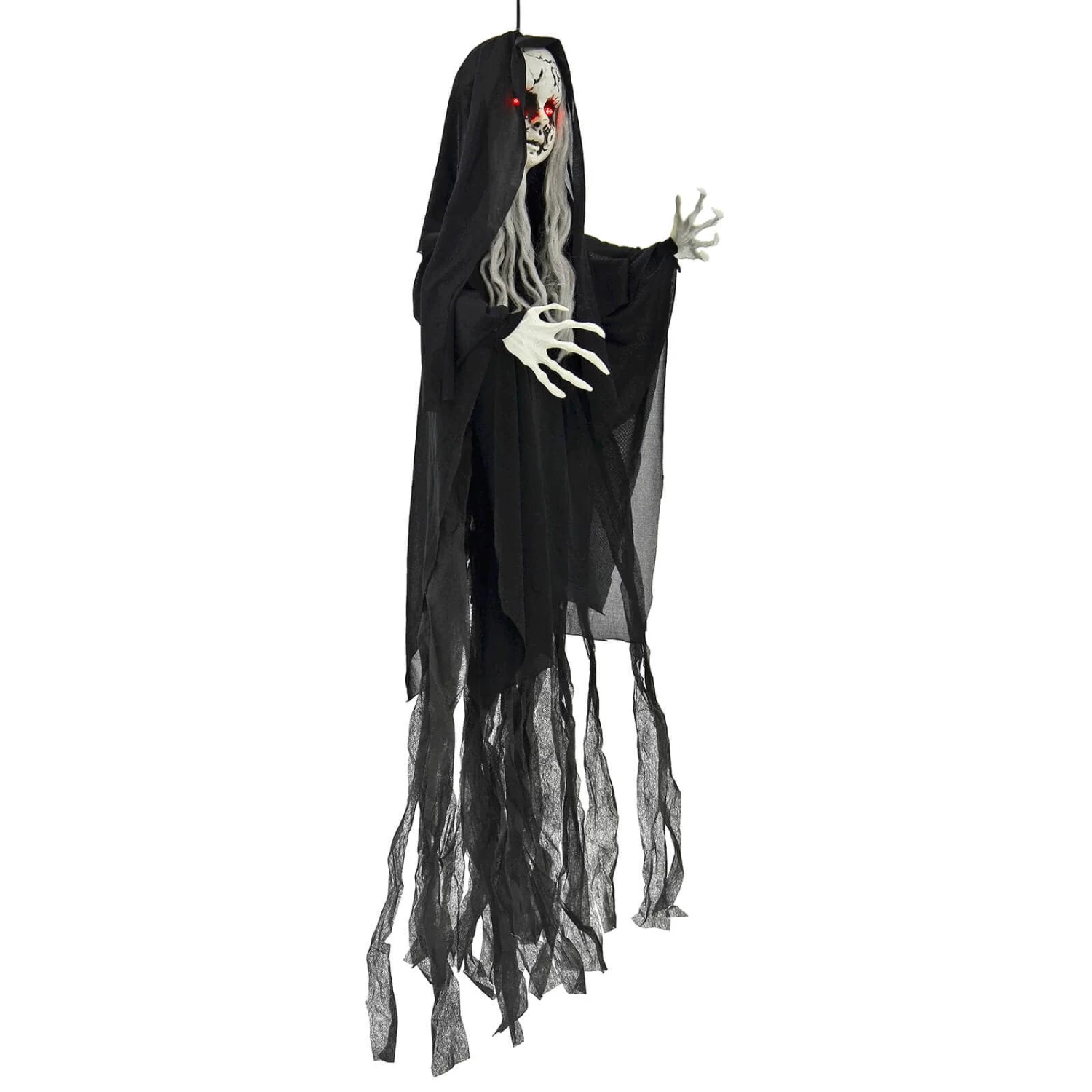 The 1m tall, hanging scary girl has flashing red eyes and a screaming laugh that would curdle milk. She has a complexion to die for, long grey hair and flowing black robes. Wire in the arms let you pose her however you please. Hang her up for a really creepy Halloween decoration.