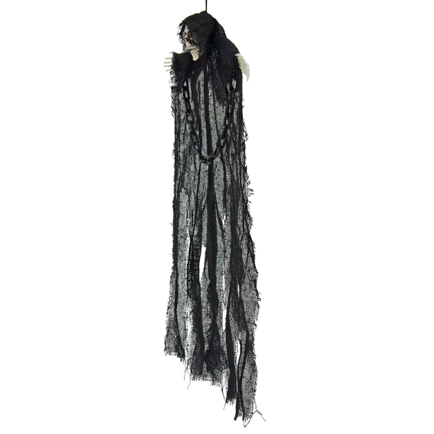 The Hanging Skeleton Halloween decoration has chains on its wrist and long black robes. With posable arms to display however you want. At 60cm (24″) tall it’s perfect for Halloween parties. Suitable for indoor use only.