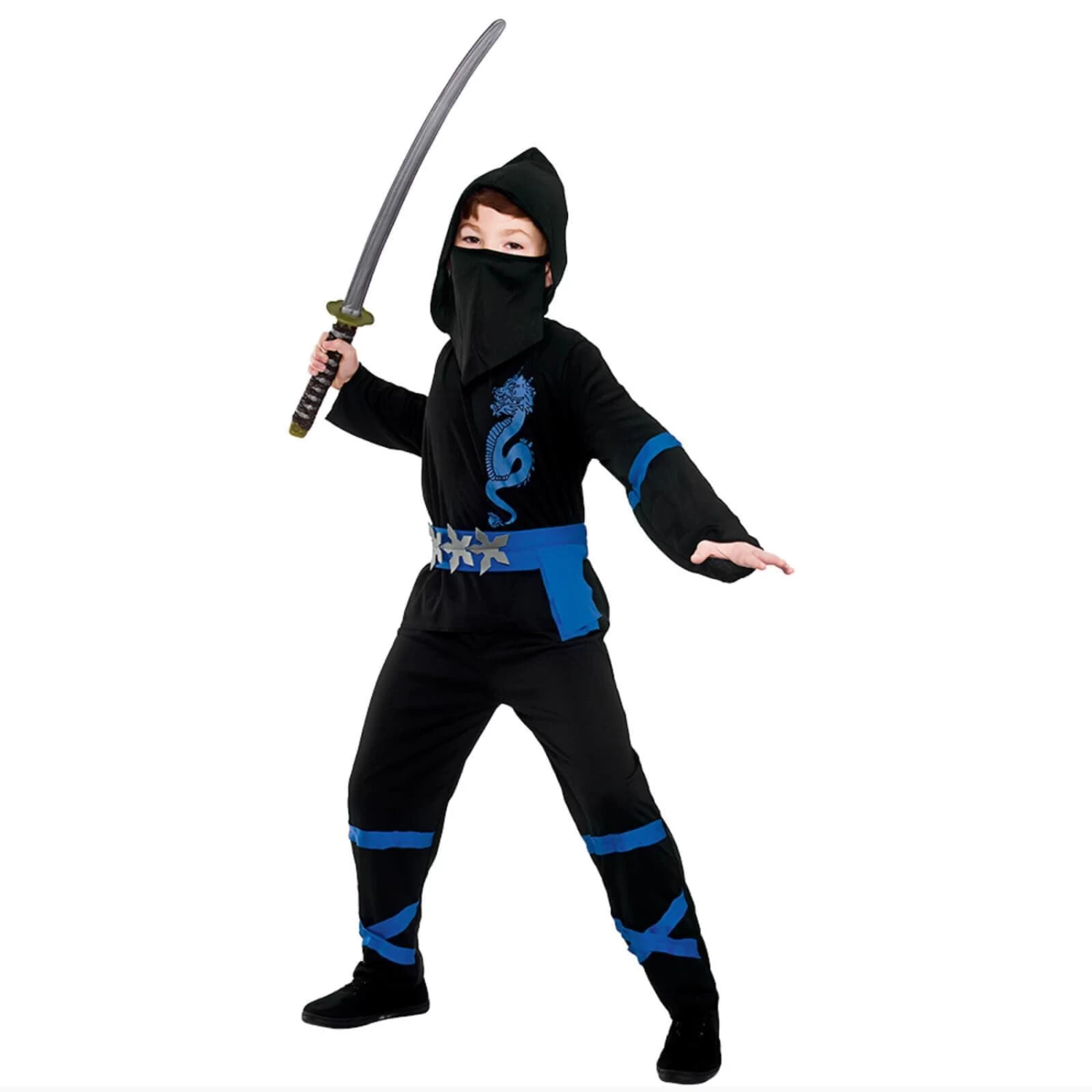The Samurai warrior outfit for boys and girls includes black hooded shirt and trousers with colour trim and dragon detail. The belt is decorated with silver fabric throwing stars. The child’s power ninja costume is complete with a black face mask.