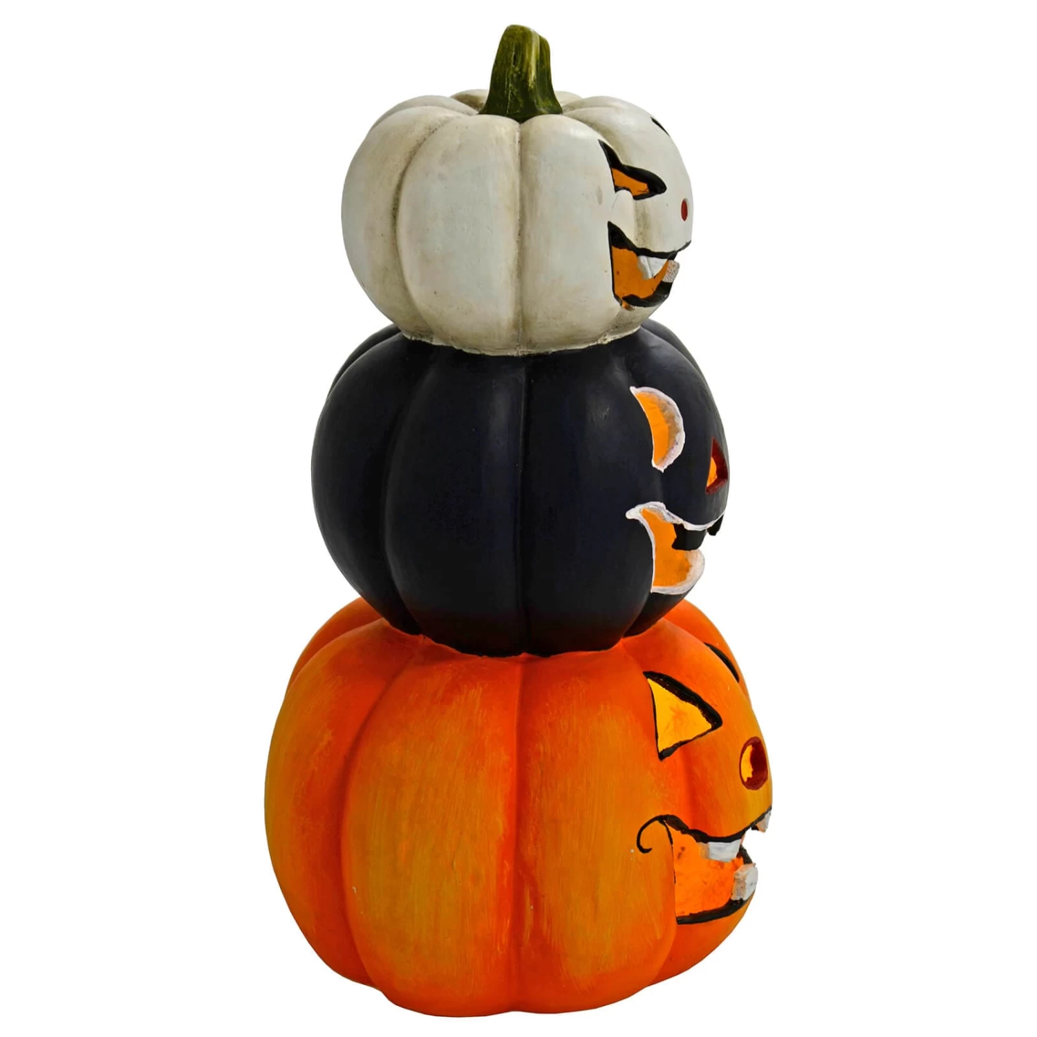This Pumpkin Lantern Stack Halloween decoration from Cackle & Co. is lit by a cluster of 10 LED lights in the base. The large, heavy ceramic Halloween decoration has 3 detailed pumpkins in orange, black and white. Each pumpkin face has a different carving. Standing 60cm (2′) tall it will make a big impression on trick or treat visitors.