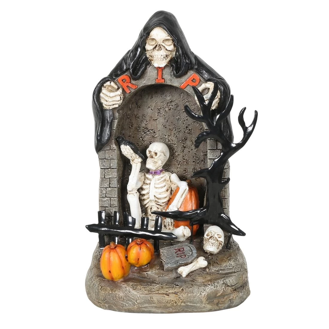 This detailed, hand painted ornament features a skeleton sitting in an arched tombstone with RIP along the top, a 3D metal fence and tree, pumpkins, gravestone, skull and bone. There’s also a hooded skeleton figure looming over the tombstone. The tombstone is up-lit up by 2 green LEDs too.