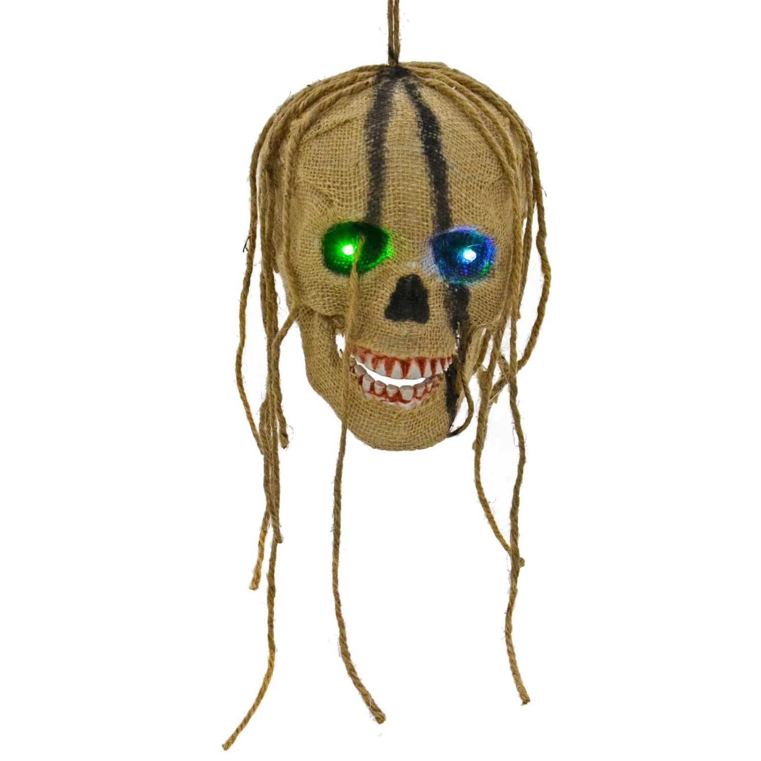 The hanging, light up skull has flashing colour change LEDs in the eyes. The skeleton head has a hessian covering and rope string hair giving it a tribal look. Perfect for a voodoo or witch doctor theme Halloween display. Comes with hanging loop. Suitable for indoor use only.