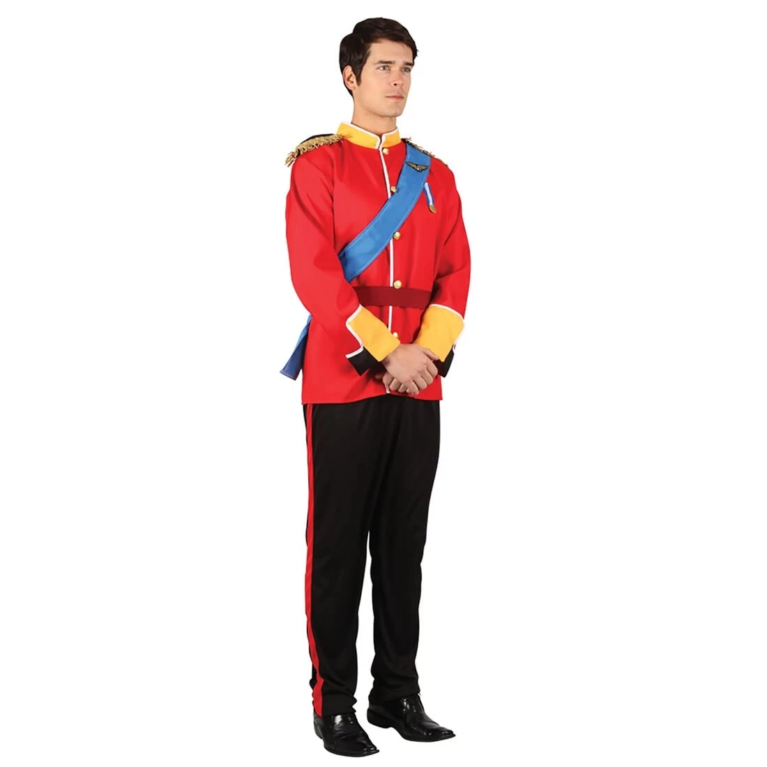 The costume includes a red jacket with gold collar and cuffs, blue sash, red belt and black trousers with a red side stripe.