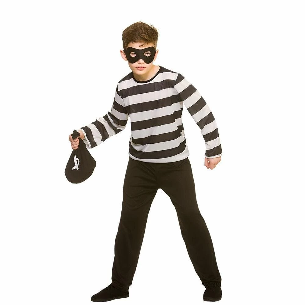 It includes a black and white stripe shirt, black trousers, mask and swag bag. Great for carrying all their party treats!