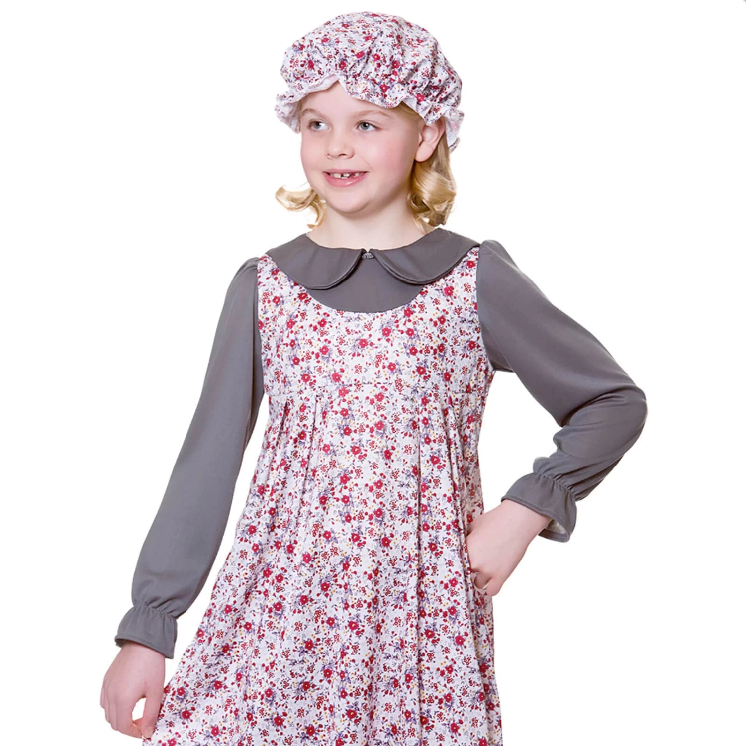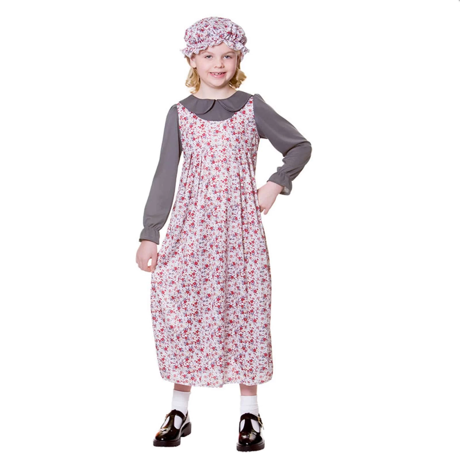 The Victorian Girl outfit includes a long floral print dress with attached grey blouse, and a matching floral print mop hat. Perfect for Halloween fancy dress parties, historical theme events, theatre and drama groups, dressing up and role play fun.