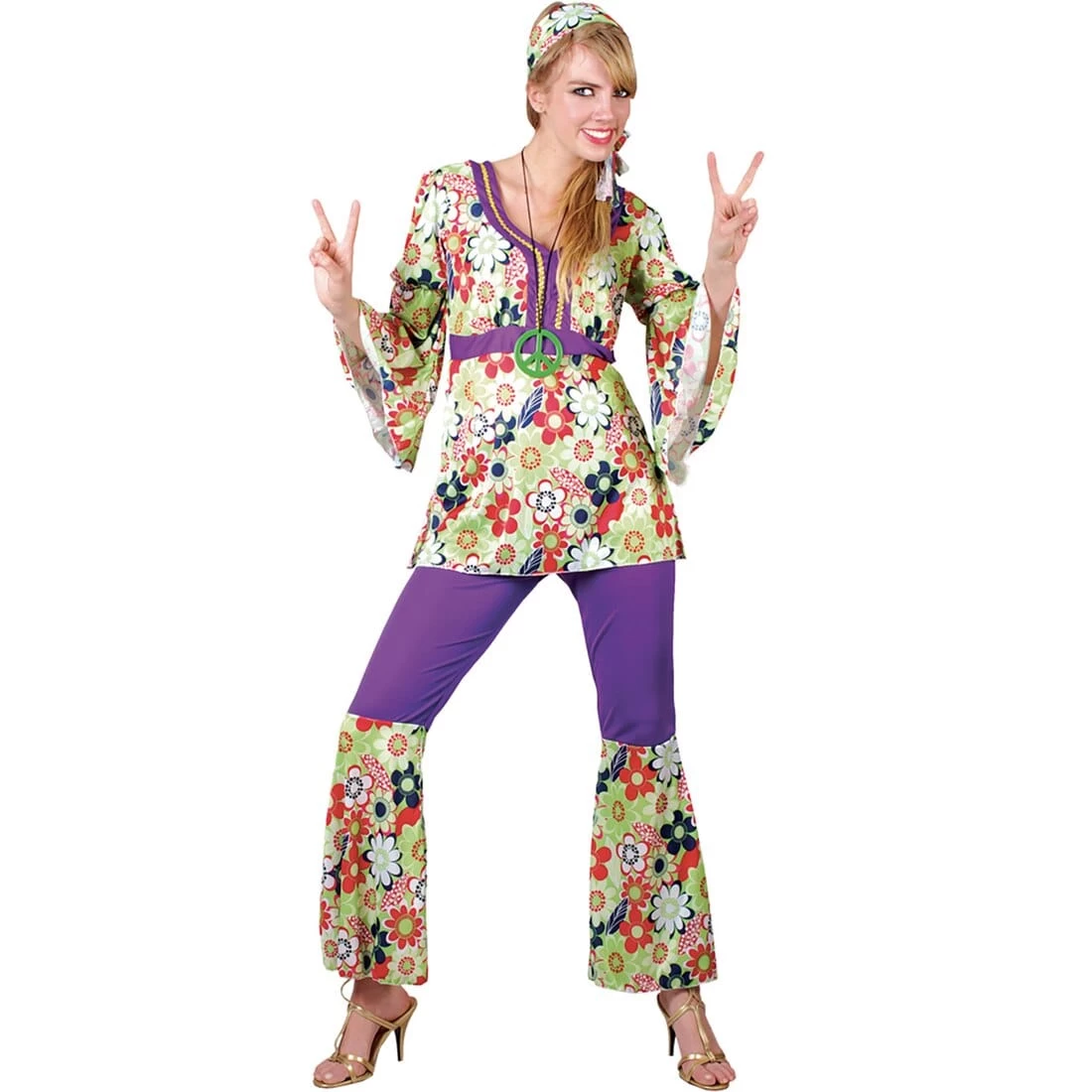 This groovy costume features a flowery patterned top with flared sleeves and purple trim. It also has purple trousers with flowery patterned flares and a matching headband. It includes a peace sign medallion necklace to complete the look. Please note that the sandals are not included. Accessories are sold separately.