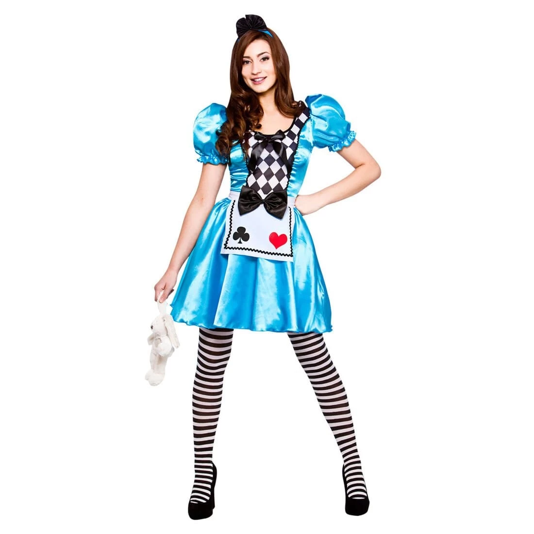 This pretty costume features a blue, satin dress with puff sleeves and a white apron, decorated with a black and white diamond pattern, black bows and card suit emblems.